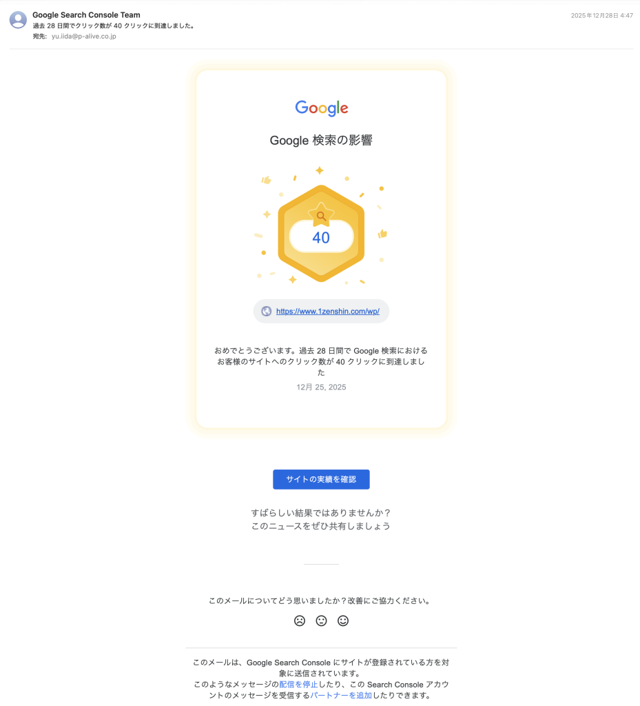 ゼンシン(株)様のホームページへのクリック数が過去28日間で40クリックに到達した